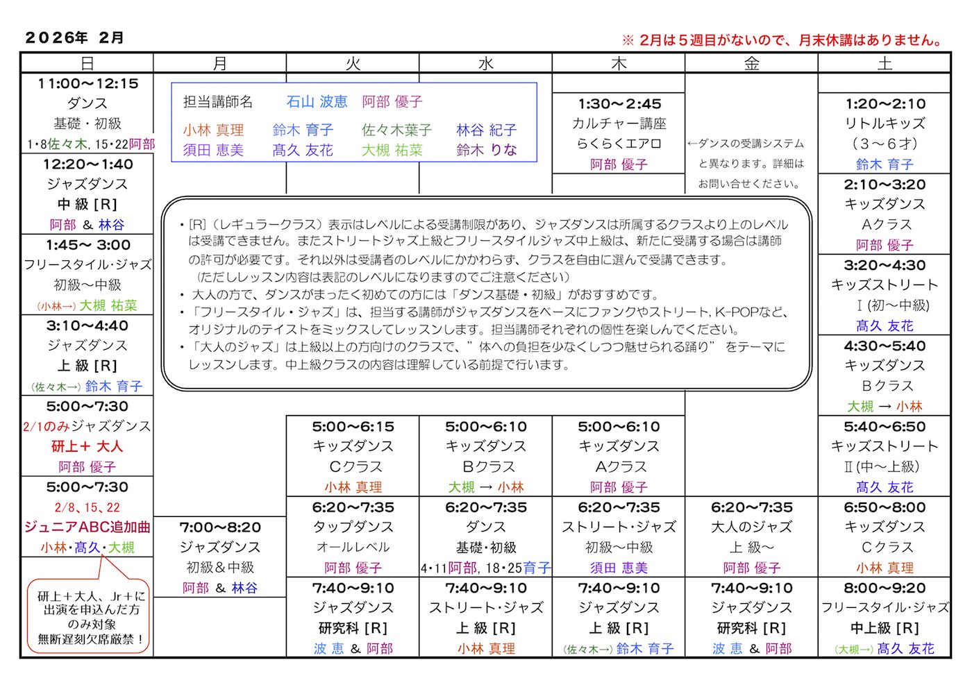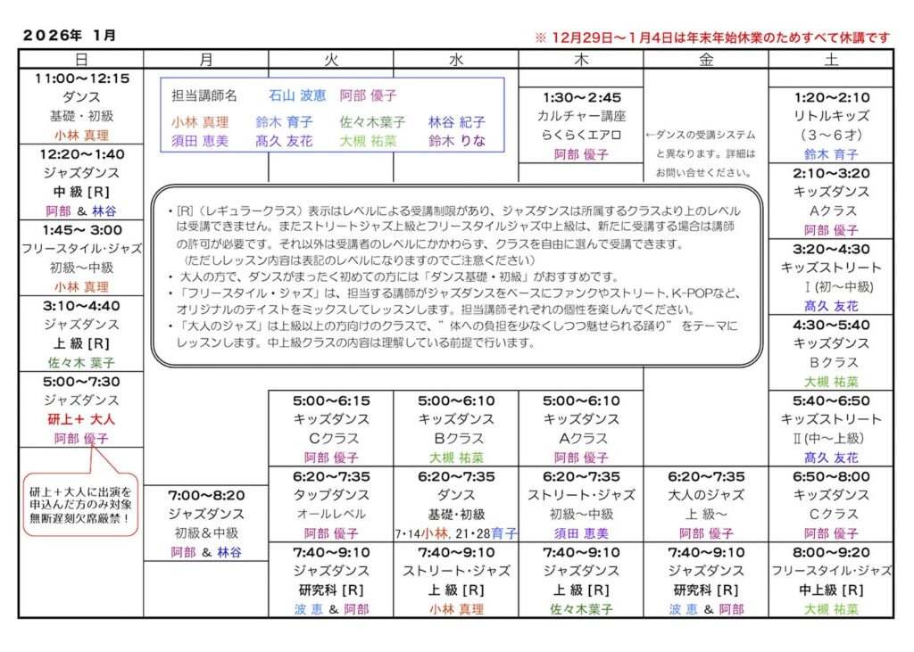 ■スタジオ・レッスンスケジュール(クラスとレベル)